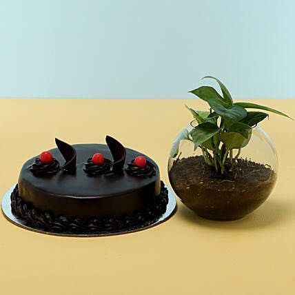 Product Details: Eggless Chocolate Truffle Cake- 500 gms Plant Name- Money Plant Plant Height- Upto 5 inches Round Glass Vase-