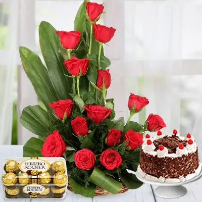 Basket arrangement of 15 Red Roses. With fillers along with 500 gm Blackforest Cake 16 pcs Ferrero Rocher Chocolate box