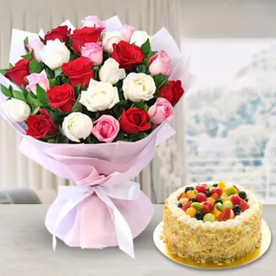 Bunch of 24 Red, Pink & White roses with foliage, 500 gm Creamy Vanilla Fruit Cake,