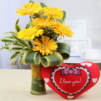Yellow gerbera in a vase. With heart shape cushion (medium)