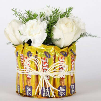 4 White Carnations 3 White Rose 10 Five Star Chocolates 22.4 gms Each Round Glass Vase With Oasis Foam Tied
