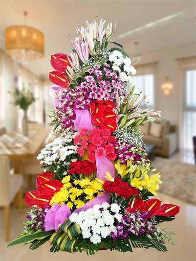 A gorgeous standing arrangement of red, pink, purple,yellow – lilies, carnations,anthurium,orchid that is truly captivating. tall arrangement – 5 feet