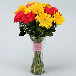 8 red carnation and 8 yellow gerbera arrange with a clear vase.