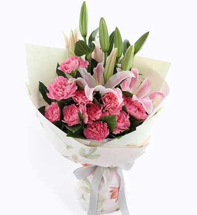 3 Pink Oriental Lilies and 10 Pink Carnations bouquet Wrap them elegantly with premium paper