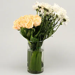 18 Tea colour roses and 5 stems of white chrysanthemum elegantly arranged in a clear vase