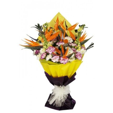A gorgeous standing arrangement of red, pink, purple,yellow – lilies, carnations,anthurium,orchid that is truly captivating. tall arrangement – 5 feet