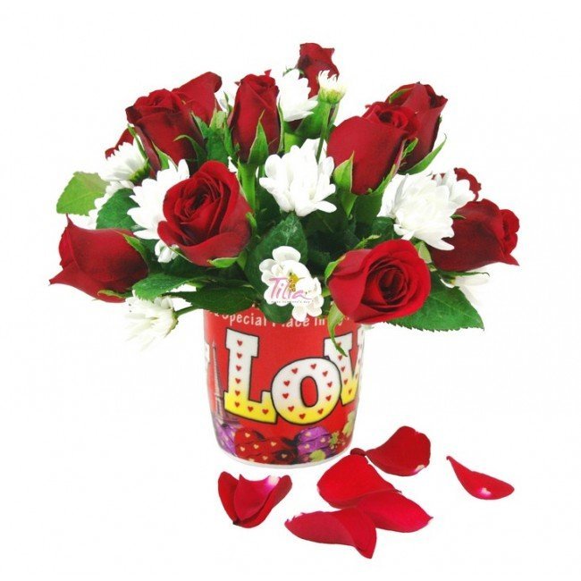 15 stunning red roses and lots of white chrysanthemums in a special MUG!